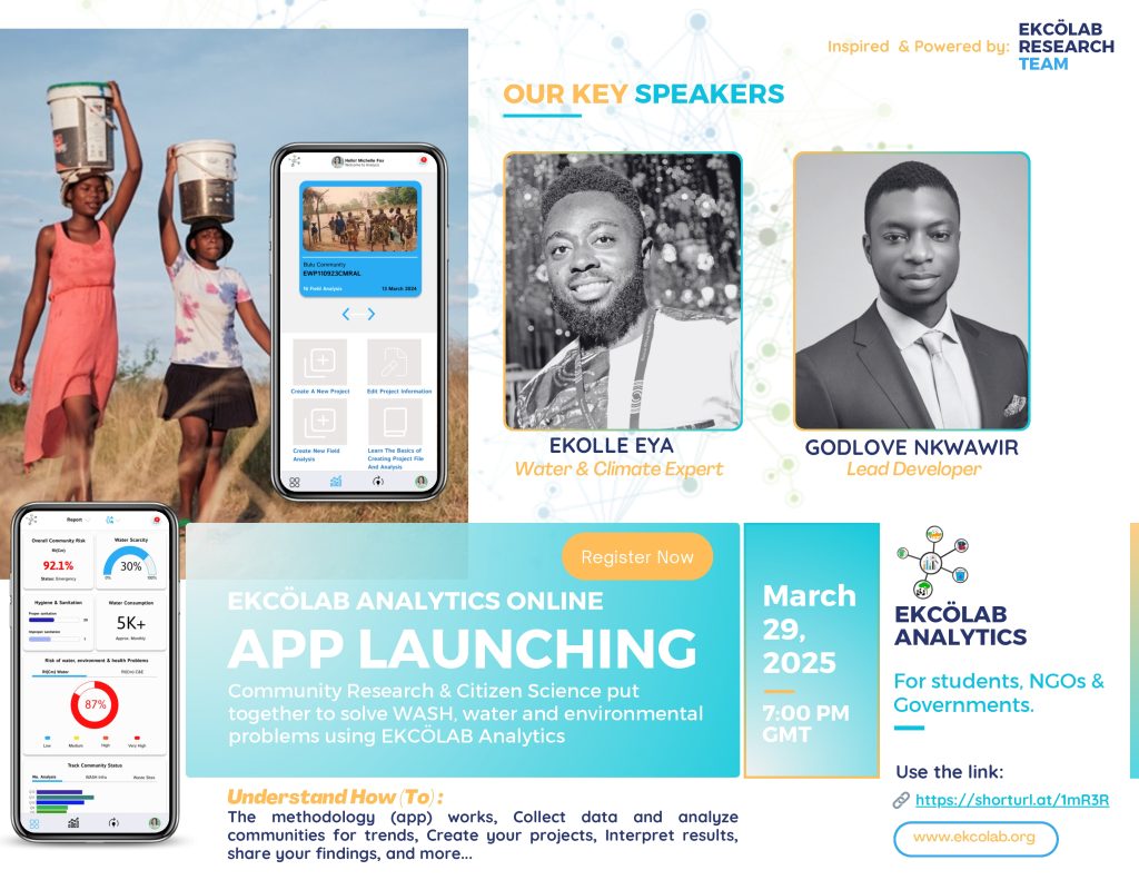 On March 29, 2025, EKCÖLAB Launched its cutting-edge innovation to the world through an online gathering of over 750+ attendees. Through this event the founder explained how the EKCÖLAB Analytics tool works and how it can help students, organizations and governments to make good use of community data and interpret problems and find possible solutions to their water and environmental problems.